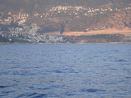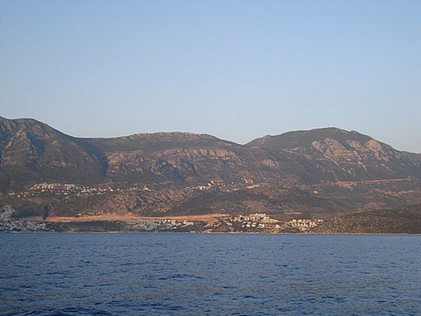| Village de Kalkan au fond d'une grande baie avec des flancs montagneux raides |