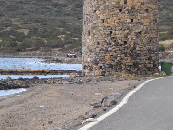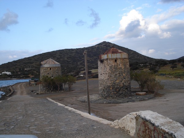 | Vestige de trois moulins à vent devant Elounda sur la petite bande de terre entre la lagune et la baie de Mirabello |