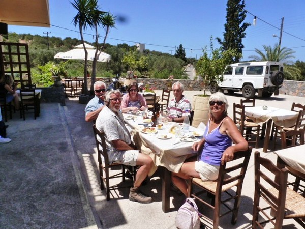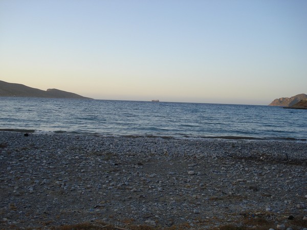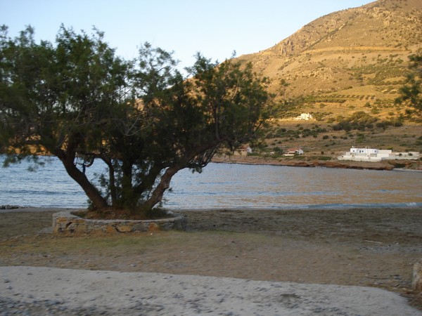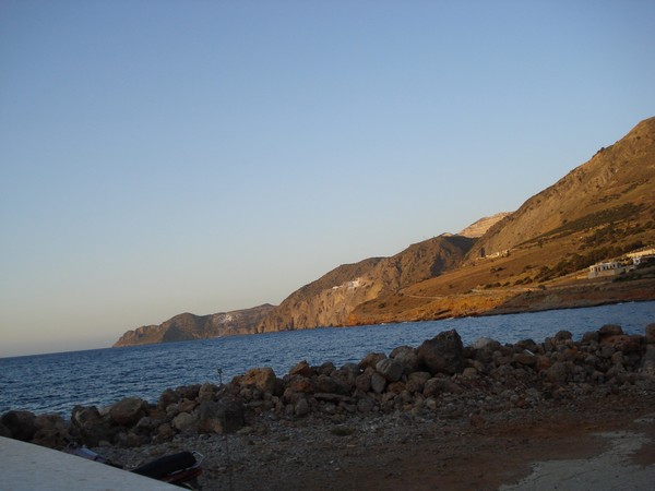 | Vue du restaurant à Monastiraki, en face Ag Nikolaos de l'autre côté de la baie | Petit restaurant où l'on a très bien mangé, feuilles de choux roulées avec riz et herbes, fromage de chèvre mélangé à des herbes, purée de fèves, grosse côtelette de mouton avec frites |