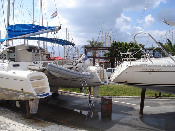 Nikolaos le 05/04/2013 Je suis arrivé à 21h à la marina parti à 7H de Beaune, je n'ai pas eu de bus tout de suite à l'aéroport d'Héraklion. La bâche plastique était déchirée, je n'avais plus de tonneau pour m'aider à monter sur le bateau (3m), la marina est pleine de bateaux à quai. J'ai devant un gros catamaran et 5 autres bateaux autour que je n'avais pas au départ. Beaucoup de bateaux de professionnels sont là pour se préparer pour la saison touristique, voiliers en location, bateaux de ballades avec vue sous marine etc. J'ai galéré pour grimper à bord et ôter la bâche, j'ai dû finir vers 22h30. Il y avait beaucoup de vent du sud, très chaud 28° à l'aéroport (venant de France j'avais l'anorak sur le dos!!). Mauvaise surprise encore cette année, j'avais une très mauvaise odeur dans la cabine, les cales sous le moteur étaient pleines d'eau saumâtre, je n'en ai pas dans le moteur ni l'inverseur mais le démarreur a trempé dedans. Le sol du pont, du cockpit est noir de sable très très fin. Après pompage et nettoyage à grande eau, je vais devoir gratter et repeindre l'inverseur et le bas moteur. Le revêtement plastique du fond est décollé par endroit, conséquences des huiles de l'année précédente et d'avoir eu de l'eau salée plusieurs mois ( il y a tout à l'arrière une cale inaccessible étroite et profonde, pleine d'eau salée qui était rentrée par l'axe du gouvernail (pressé toupe à refaire). Lundi 8/04 changement de température, le vent est tombé mais les degrés aussi 12° le matin dans le bateau sans chauffage à gla gla. Quelques petits problèmes annexes d'électricité et de gaz. J'ai dû démonter la gazinière encastrée pour changer le tuyau et le raccord cuivre endommagé. Quand on bricole chez soi on a toujours quelque chose qui manque alors imaginez le temps que l'on peut perdre dans une ville grecque en vélo seulement pour trouver ce que l'on a besoin et il n'y a pas de supermarché du bricolage il faut faire plusieurs petites boutiques. |