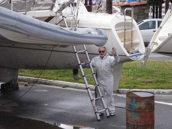 Michel en cosmonaute pour le ponçage de l'antifouling |