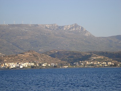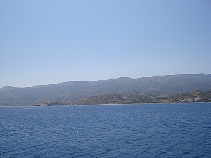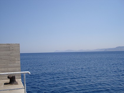 | Bout de la jetée où je suis, tout au bout le cap et Karpathos |