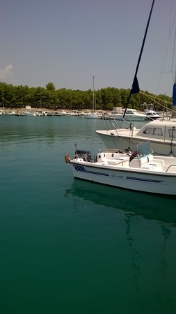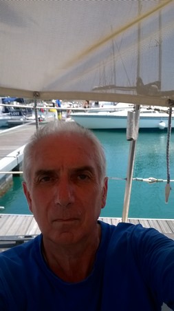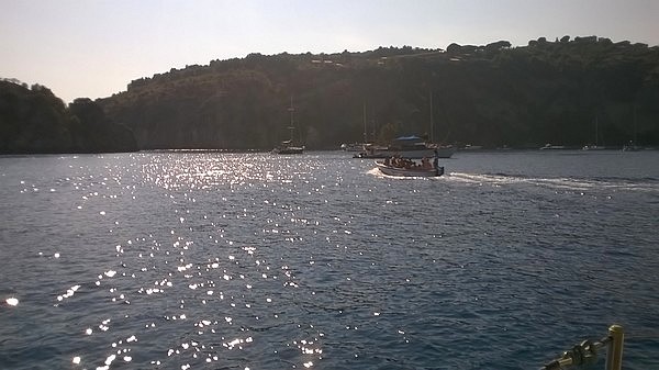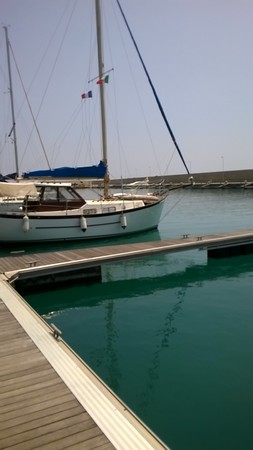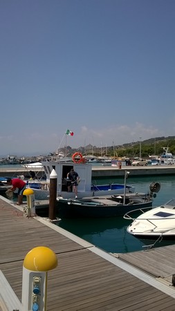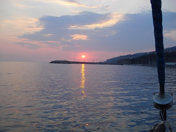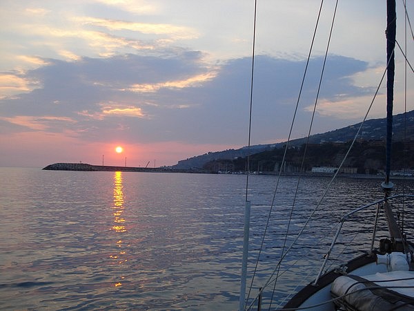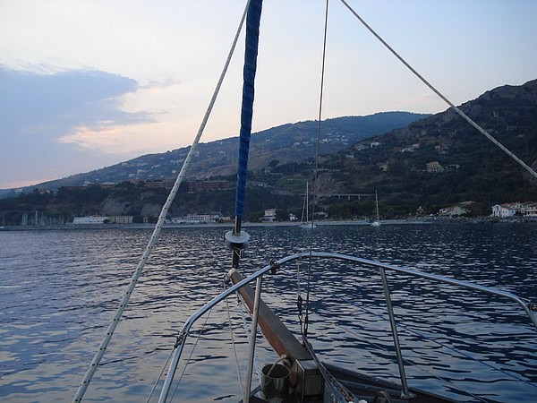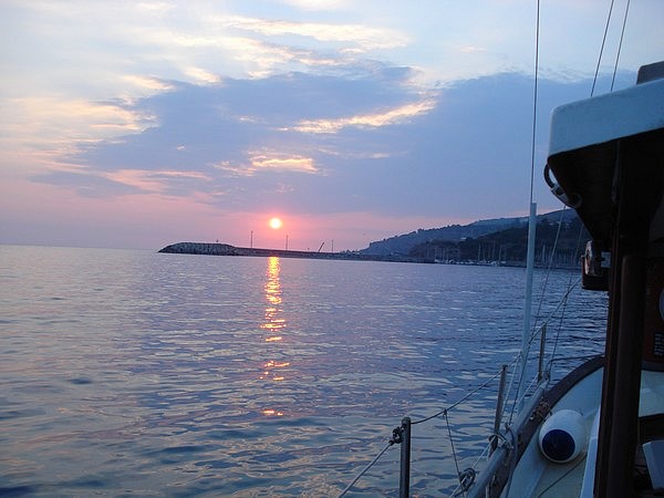 | Je suis parti à 6h mais en sortant du port je me suis rendu compte que mon gps ne me donnait aucunes valeurs. J'ai essayé de voir le problème mais avec les vagues je suis revenu au port. J'ai réussi au bout d'une heure ce qui m'a fait arriver à la nuit. Au 3/4 du parcours je fus contrôlé par la Guardia di finanza équipée d'un bateau militaire avec canon et super rapide. Ma première journée de navigation m'a fatigué, je n'ai plus 20 ans, j'ai finalement passé une journée de plus dans la marina. | |